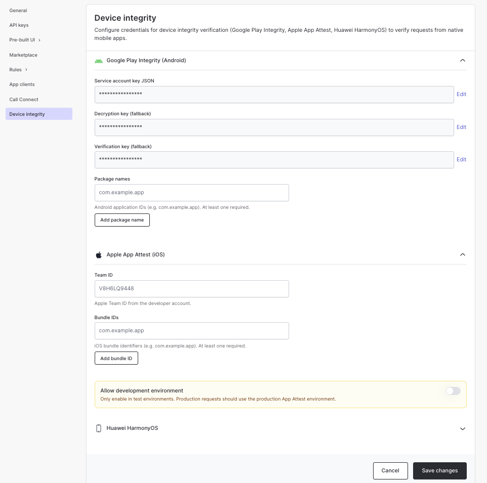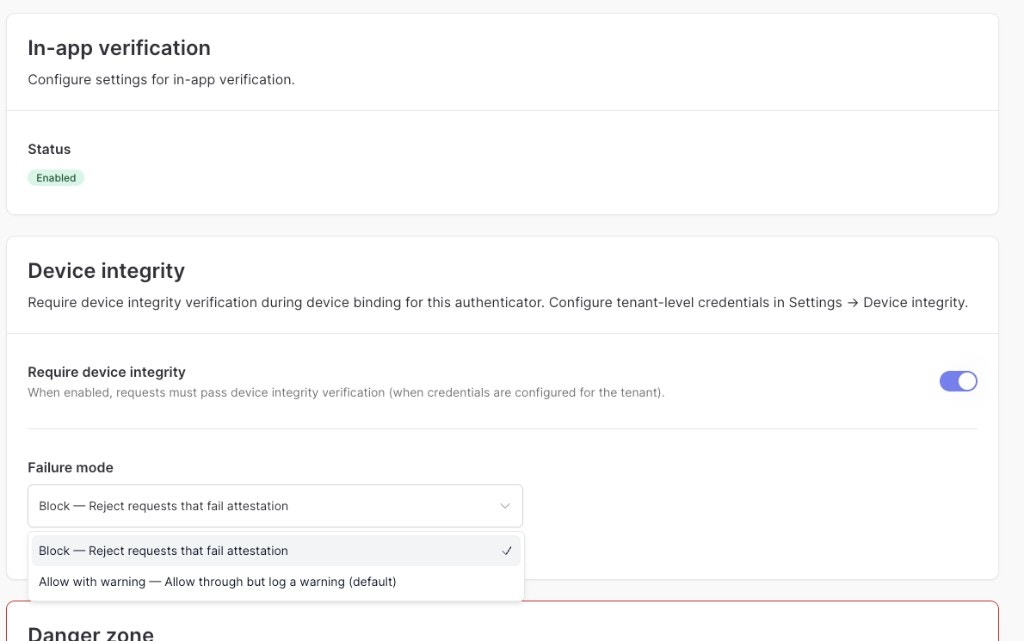 Enable device integrity verification for your tenant in the Authsignal Portal.Configuration